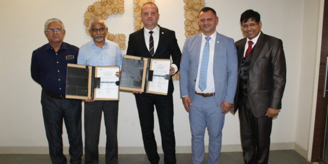 जयपुर| भारतीय स्किल डेवलपमेंट यूनिवर्सिटी, जयपुर ने तिमिसोआरा, रोमानिया के Banat University of Agriculture Sciences and Veterinary Medicines के साथ एक सहमति पत्र पर हस्ताक्षर किए हैं। सहमति पत्र पर हस्ताक्षर करने के दौरान Banat University के वाइस रेक्टर आफ इंटरनेशनल रिलेशंस एंड स्टूडेंट्स अफेयर्स प्रो. सोरिन स्टानस्यू, इरास्मस एंड इंस्टीट्यूशनल को-आर्डिनेटर श्री राल पास्कलाउ और बीएसडीयू से कुलपति प्रो. अचिंत्य चैधरी और स्कूल ऑफ एंटरप्रेन्योरशिप स्किल्स के प्रिंसिपल डॉ. रविकुमार गोयल उपस्थित रहे।